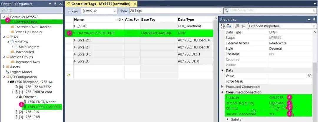 3.在1756-L72项目中,在以太网中添加1769-L30ER控制器CML30ER,在控制器标签域中,创建消费者标签HeartBeatFromCML30ER,数据类型DINT,标签类型Consumed,生产者选择CML30ER,远程标签填HeartBeat,RIP填写100ms,详见下图.