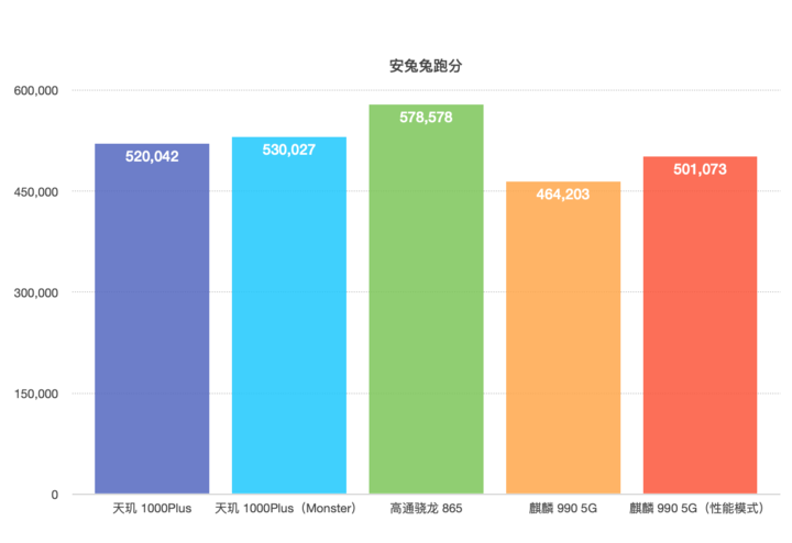 在安兔兔跑分中,骁龙865以57.8万分位居第一;天玑1000Plus的表现也不差,也能拿到52万分位居第二;麒麟9905G的成绩是50.1万分。