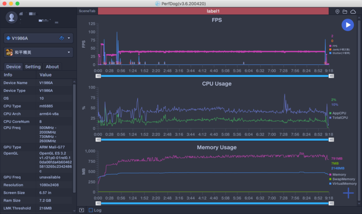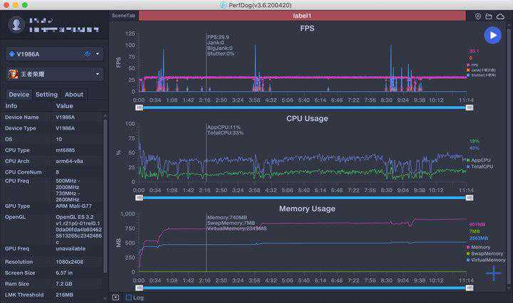 在游戏测试中,我使用《和平精英》、《王者荣耀》和腾讯Perfdog来查看游戏运行情况,在「HDR高清画质」和「超高」帧率下,手机以40fps(不排除未来手机量产后会提供更高帧率运行可能)运行,此时测试工具折线图显示占帧率和CPU稳定,除极少情况会出现卡帧外,其余时间均流畅运行。