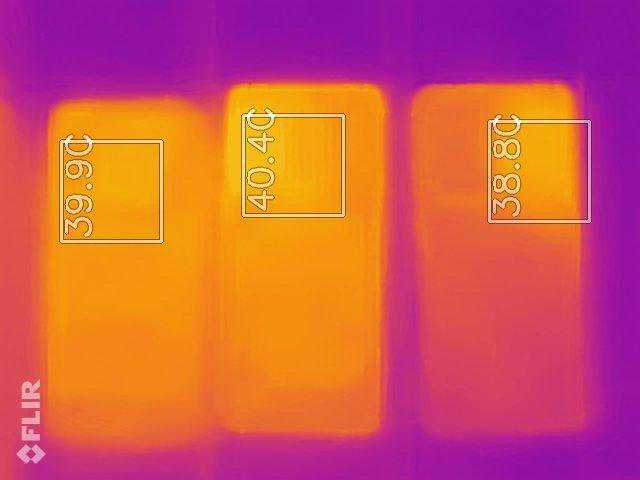测试了一轮后,我用热感仪对三款SoC进行测温,此时三款测试手机均在同一软件跑分,以模拟在相同压力下的发热情况,三款SoC的发热情况相近,骁龙865温度最高,天玑1000Plus和麒麟9905G都不到40摄氏度。