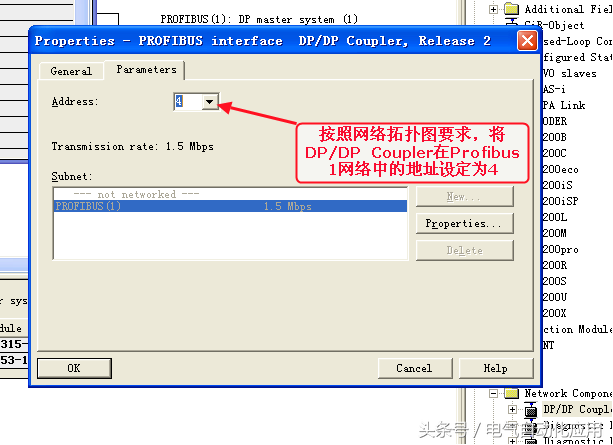 远程I/O配置完成后,配置DP/DPCoupler,它是ProfibusDP1网络和ProfibusDP2