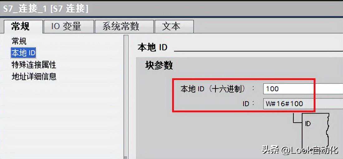 在本地ID中:设置通讯连接的ID号,本地ID在本地PLC中必须是唯一的,在后续的通信编程中需要指向这个ID,这里ID=W100,如图6所示。