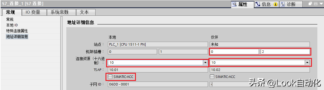 点中上面的连接,在"S7_连接_1"的连接属性中查看和设置各参数。
