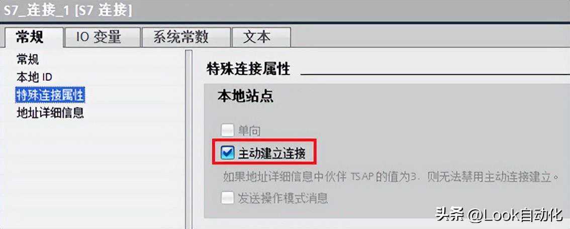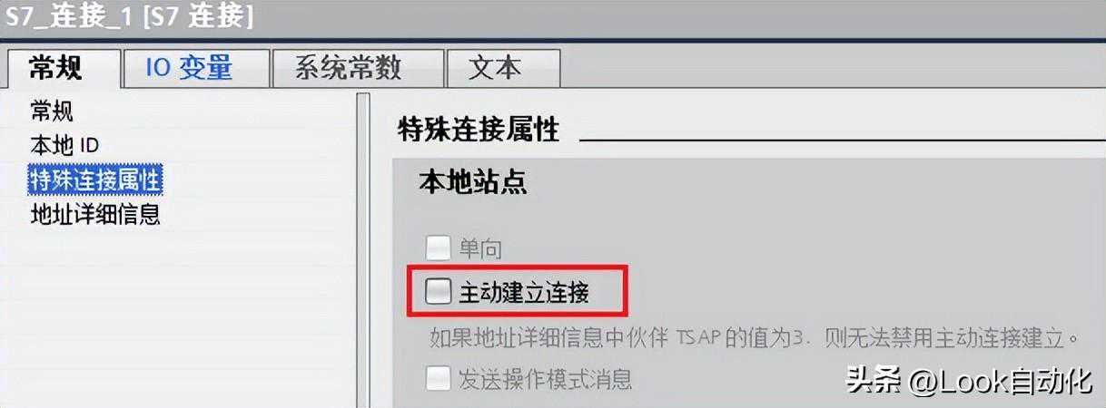 在特殊连接属性中:可以选择是否为主动建立连接。通信的双方只能有一方是主动建立连接,另一方是被动建立连接,这里S7-1500是主动建立连接,如图8所示。