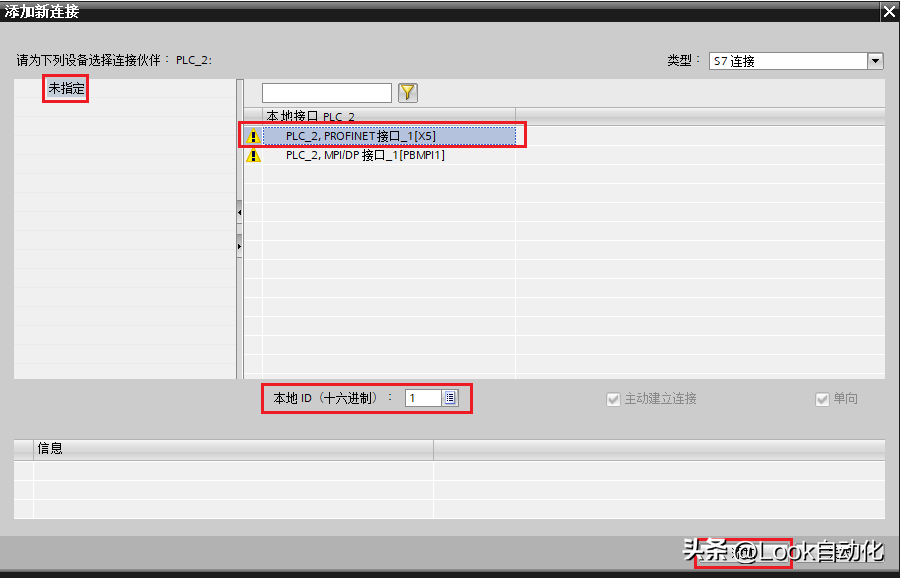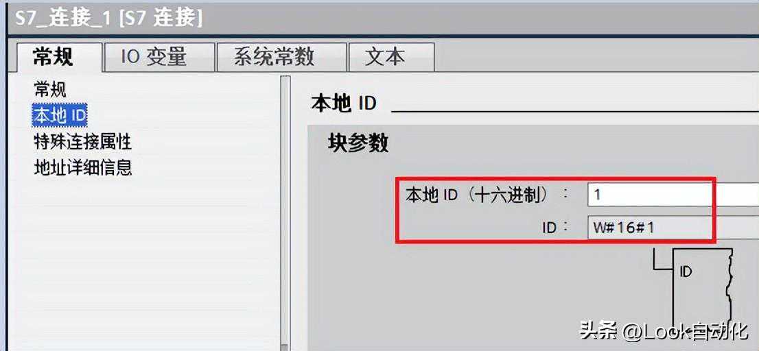 在本地ID中:设置通讯连接的ID号,本地ID在本地PLC中必须是唯一的,在后续的通信编程中需要指向这个ID,这里ID=W1,如图12所示。
