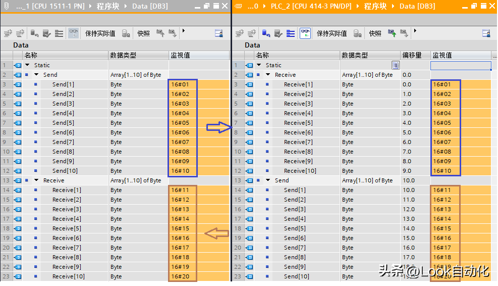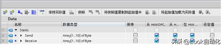 2通信编程在S7-1500和S7-400侧,分别创建用于发送和接收的数据块,定义成10个字节的数组,如图15所示。