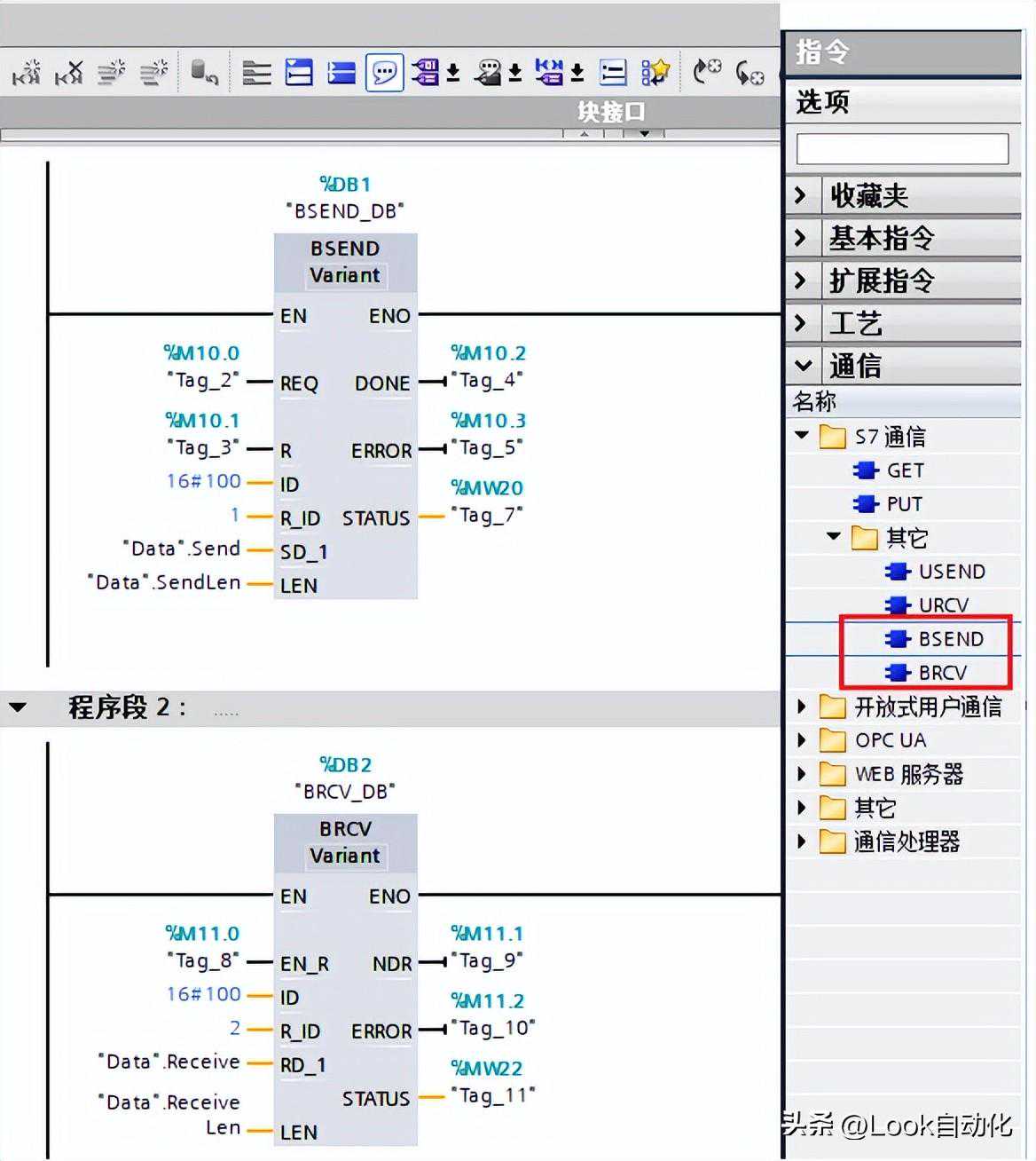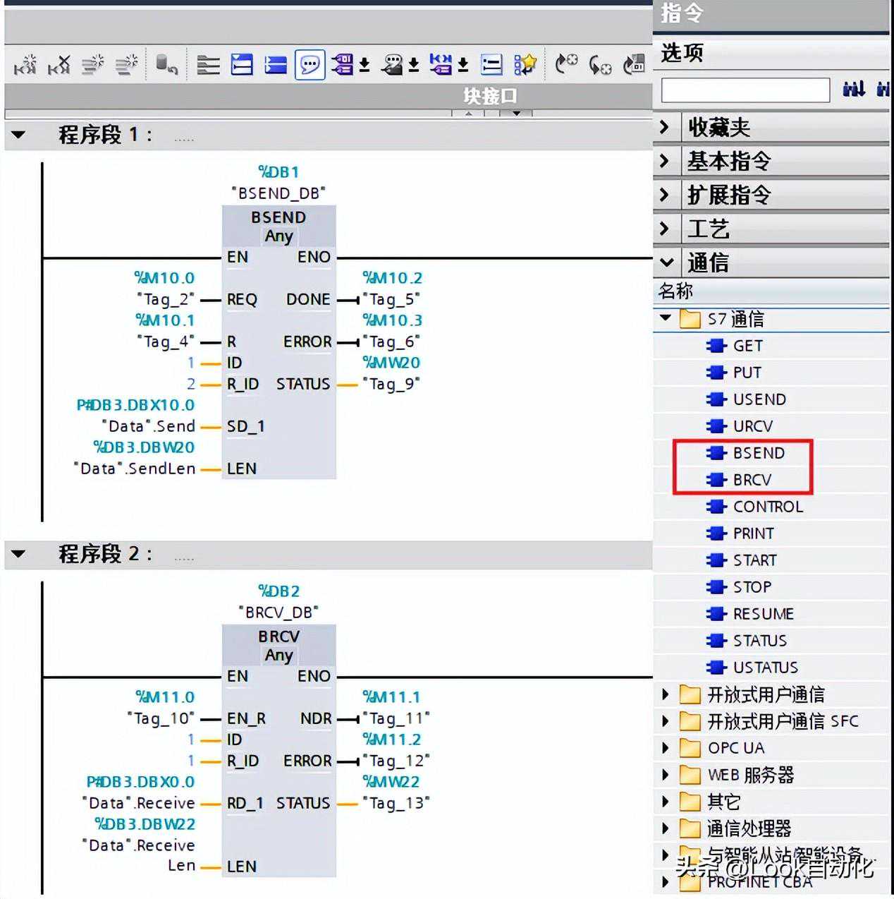 在S7-400侧,在OB1中,从"指令""通信""S7通信"下,调用BSEND、BRCV通信指令,如图17所示。