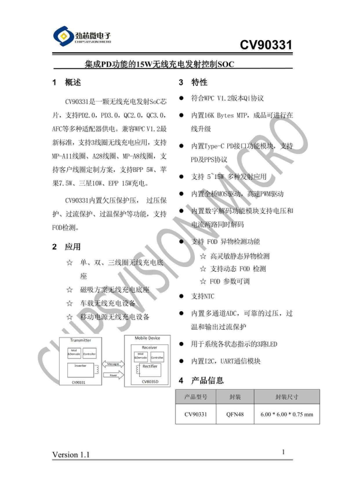 劲芯微CV90330CV90330是一颗无线充电发射SoC芯片,支持,,AFC等多种适配器供电。兼容最新标准,支持单线圈无线充电应用,支持BPP5W、苹果7.5W、三星10W、EPP15W充电。