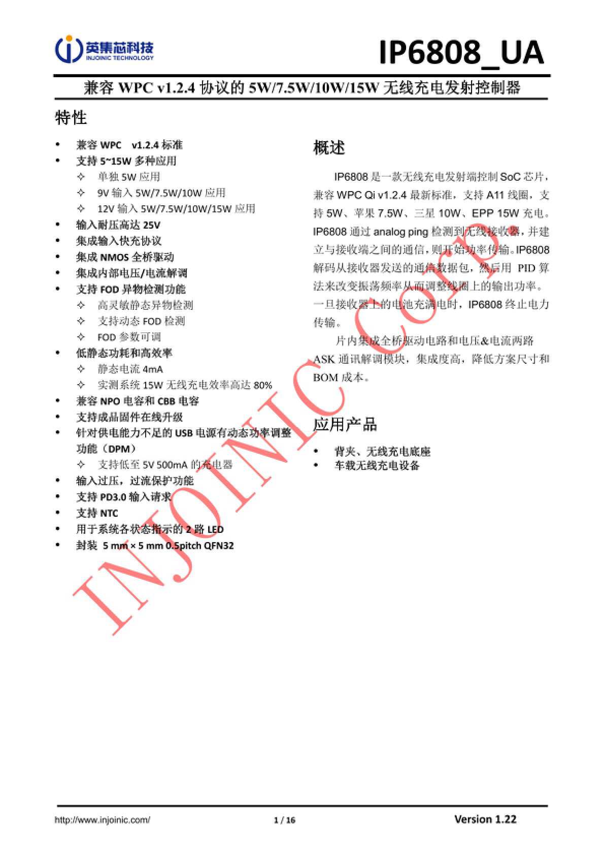 英集芯IP6808英集芯IP6808是一款无线充电发射端SoC控制芯片,兼容最新标准,支持A11线圈,支持5W、苹果7.5W、三星10W充电。
