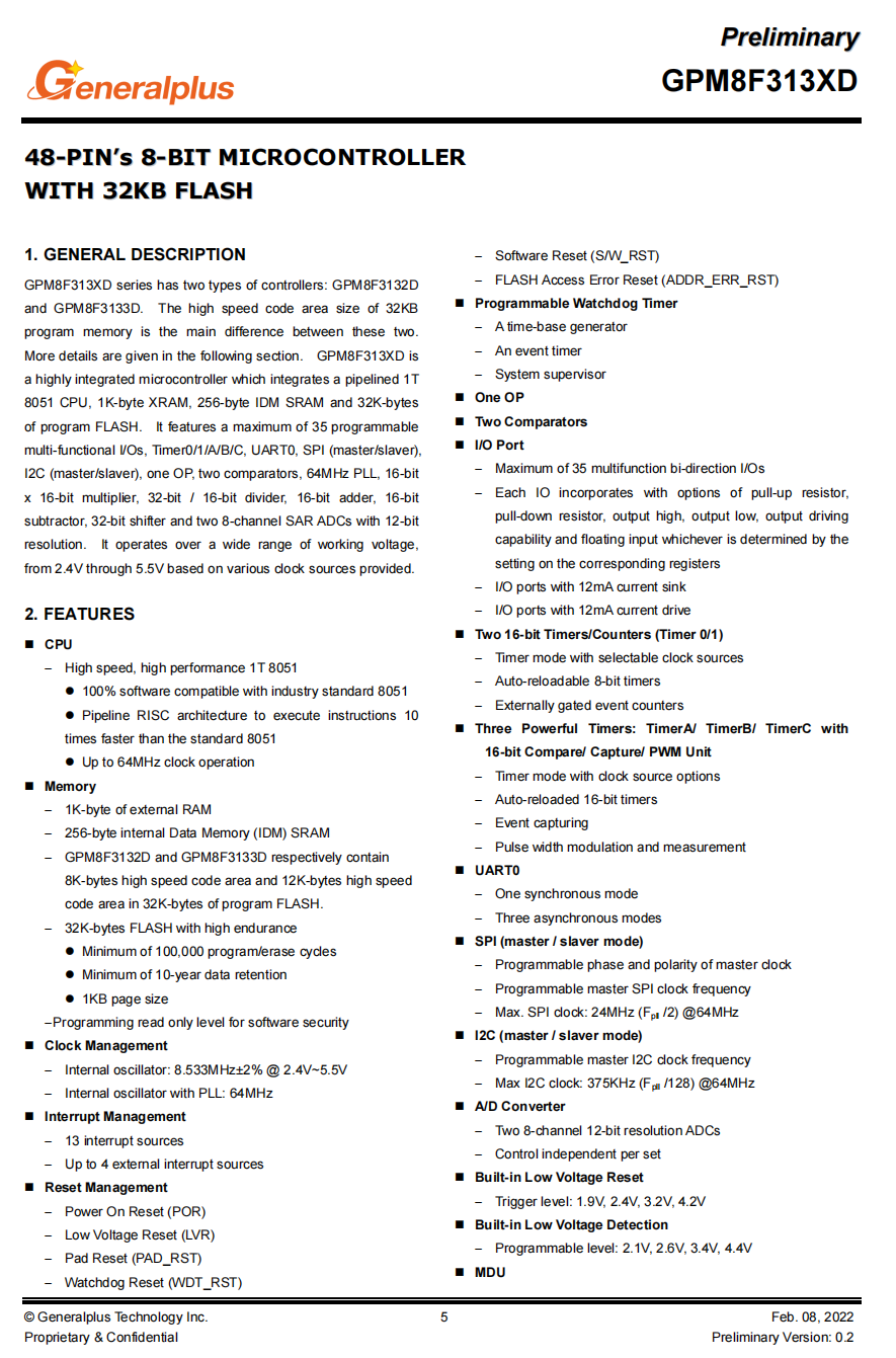 GPM32FD0338B采用QFN48封装,提供最大34个快速多功能双向I/O端口,每个I/O端口支持外部中断向量,具有15mA/20mA的源/汇流能力。
