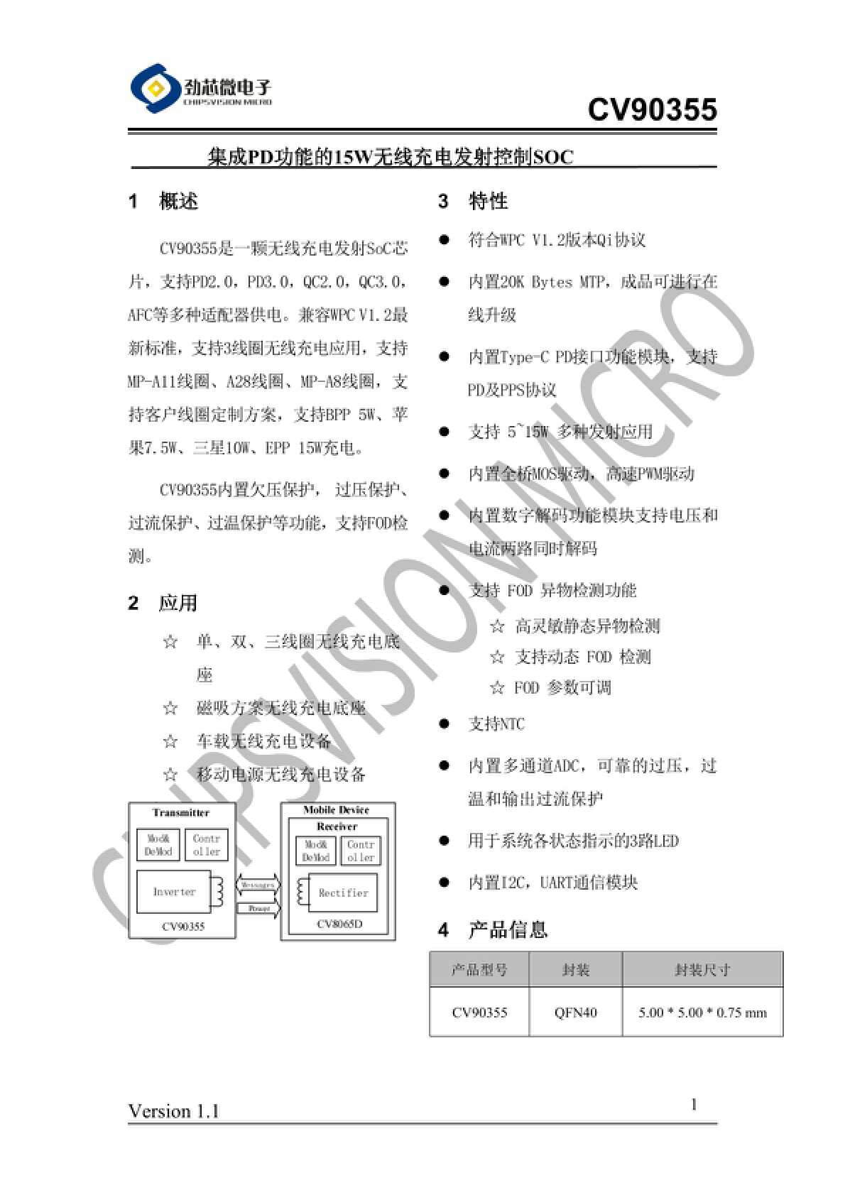 劲芯微CV90355CV90355是一颗无线充电发射SoC芯片,支持,,,,AFC等多种适配器供电。兼容最新标准,支持3线圈无线充电应用,支持MP-A11线圈、A28线圈、MP-A8线圈,支持客户线圈定制方案,支持BPP5W、苹果7.5W、三星10W、EPP15W充电。