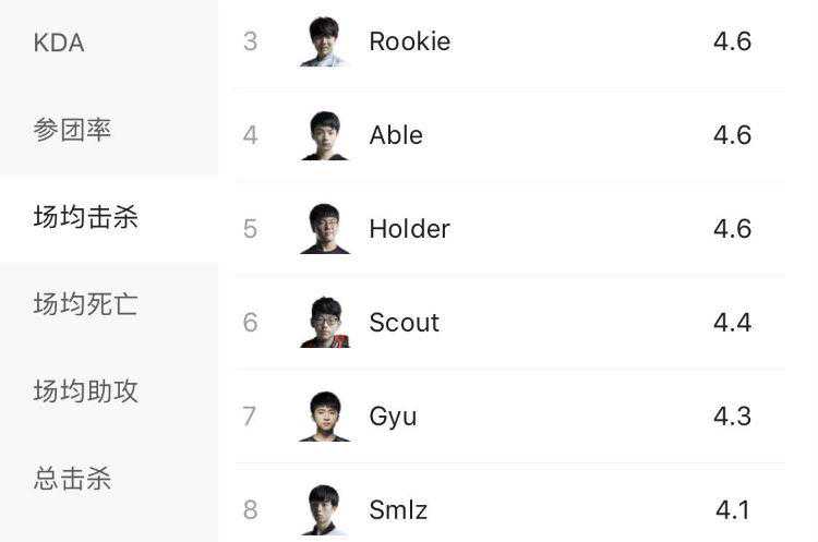 目前场均击杀王将在和之间产生,Rookie场均4.6次击杀排名第一,Scout以4.4次紧随其后,由于iG常规赛的比赛已经结束,Scout在之后的比赛中若是场均击杀能超过6次即有可能超越Rookie拿下本赛季击杀王。