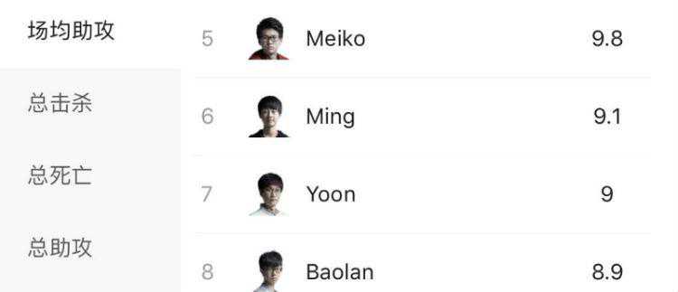与击杀王不同,助攻王几乎已经被Meiko提前锁定。本赛季他场均拿下9.8次助攻排名LPL第一,RNG辅助Ming以9.1次排名第二。EDG还有两场比赛,RNG仅剩一场。若Ming想要超越Meiko,则需要在Meiko之后比赛都不出场的情况下,还要场均拿下20次助攻才可。因此,Meiko几乎确定成为本赛季的助攻王。