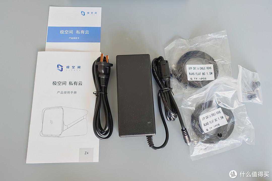 配件给的不多,但是比较实用。包括说明书、保修卡、电源适配器,以及两条扁网线、一个小螺丝刀和硬盘支架备用缓冲垫。