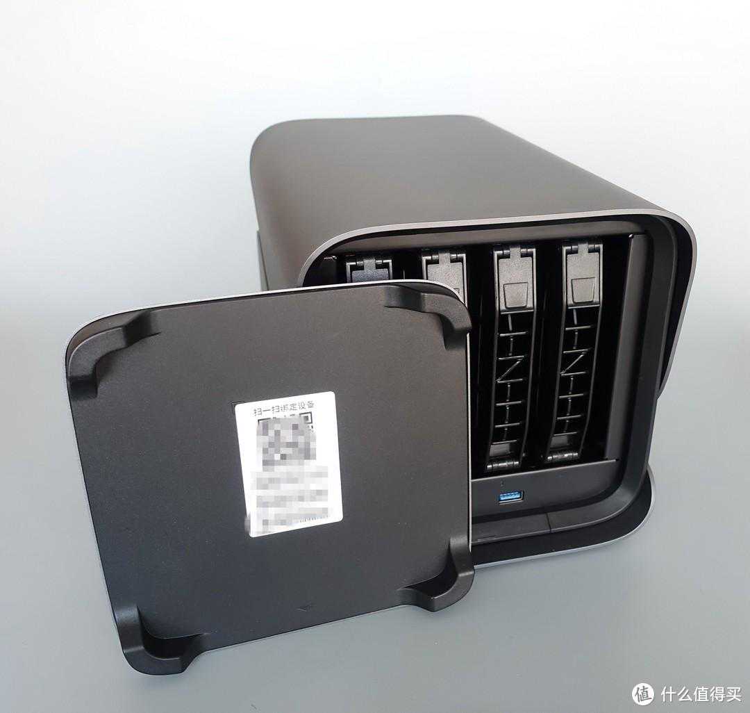 从另一侧角度来看,更像是一个Z形了。讲道理我个人挺喜欢这个炫酷的造型,感觉比起方方正正的传统NAS来说,科技范儿更足。
