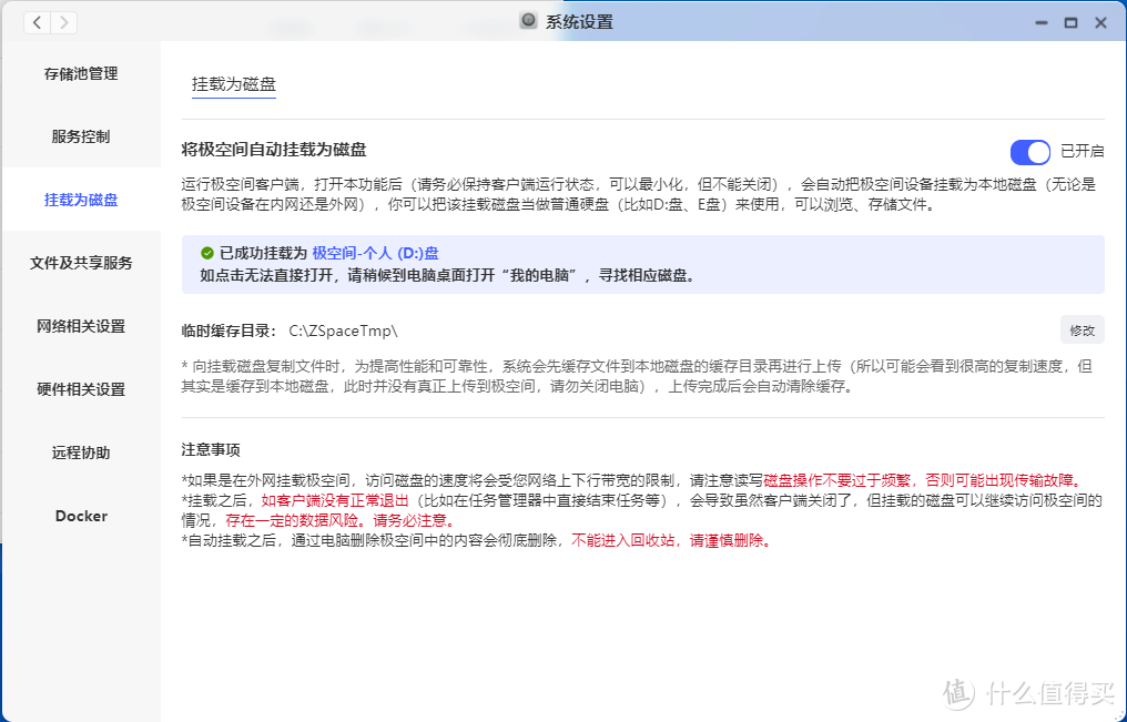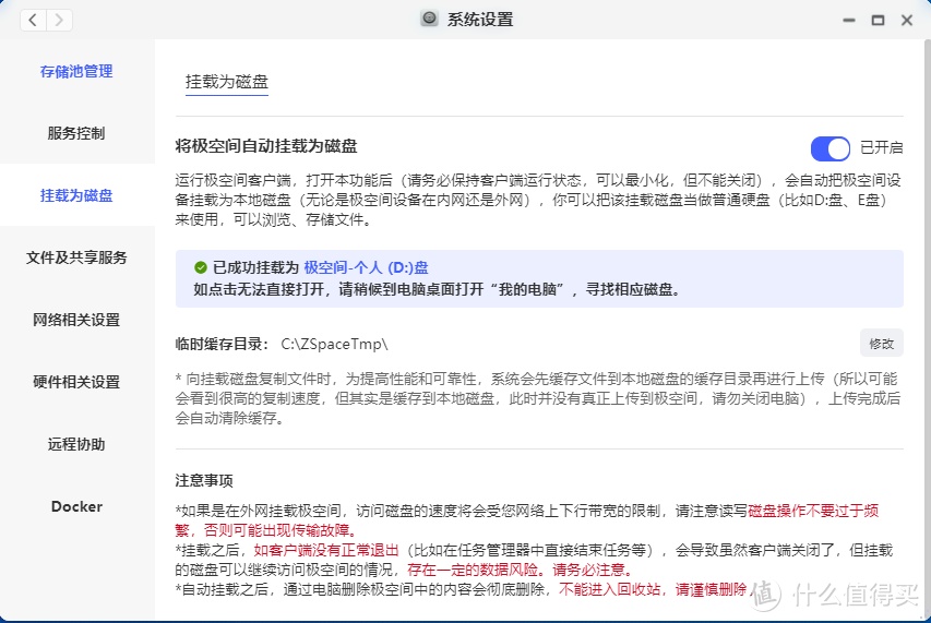 一种是前面提到的,使用系统设置中的自动挂载为磁盘功能,将极空间新Z4挂载成电脑上的一个普通分区,这种方式需要在极空间客户端运行时才有效果,但是好处是无论在不在家中局域网内,都能正常使用。