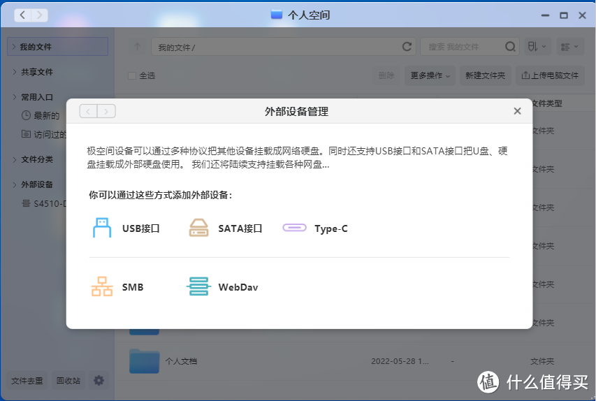 常见的USB、Type-C等方式挂载移动硬盘且不多说,这里可以看到的是,目前已经支持以SMB和WebDav协议将其他厂商NAS中的文件夹挂载过来。