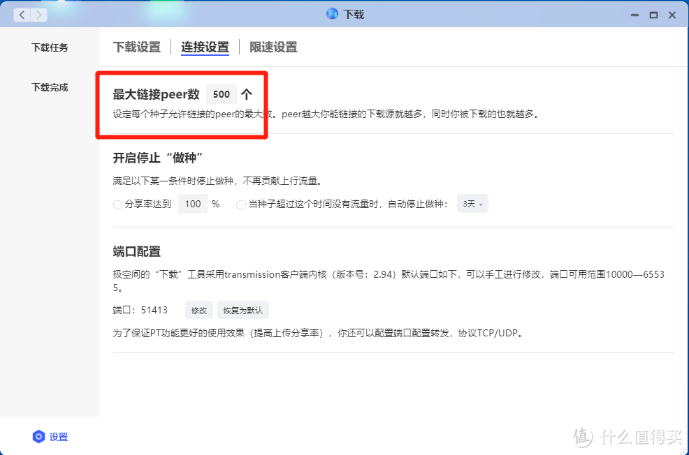 如果大家有PT下载的需求的话,建议到路由器或者光猫中把51413端口给映射一下,以增强种子上传的速度和稳定性。不过经过实测,我这里只在路由器中设置了UPNP,也能实现正常上传,并且下载速度也能达到30多MB/S.