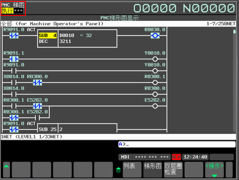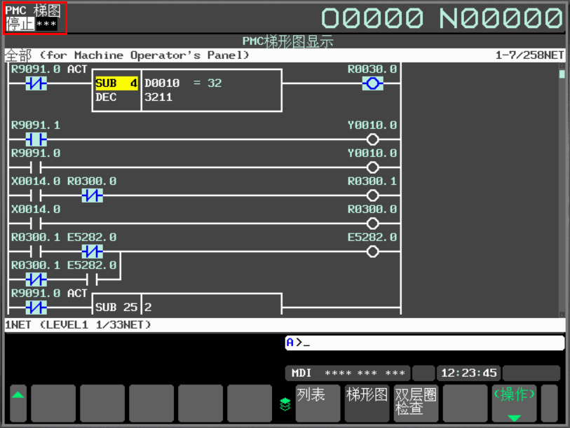 1、PMC处于停止状态:PMC如果没有运行,即便是线圈前的各开关都已接通,线圈也仍然不会输出。我们在PMC画面的左上角,很清楚的可以看到PMC目前的状态。