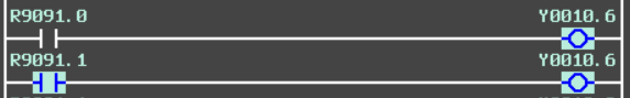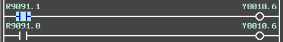 4、线圈存在双线圈:如果同一地址在PMC中有两个或者多个输出线圈,那么线圈是否输出则取决于最后执行线圈的状态,如下图所示,由于线圈的位置不同,导致输出结果不同。