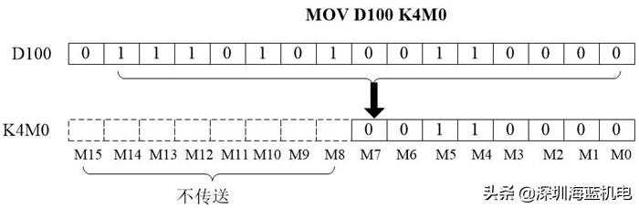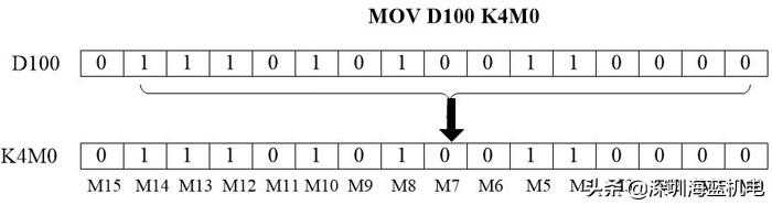 位和字的表示通过上图,我们知道位是1位二进制,字是16位二进制,在PLC中说的几位几位就是二进制的并非十进制。位软元件的组合也能处理数值,通过Kn和起始位软元件的组合来表示,在PLC程序中经常看到MOVd100K4M0,MOVd100K2M0我们看下是怎么回事: