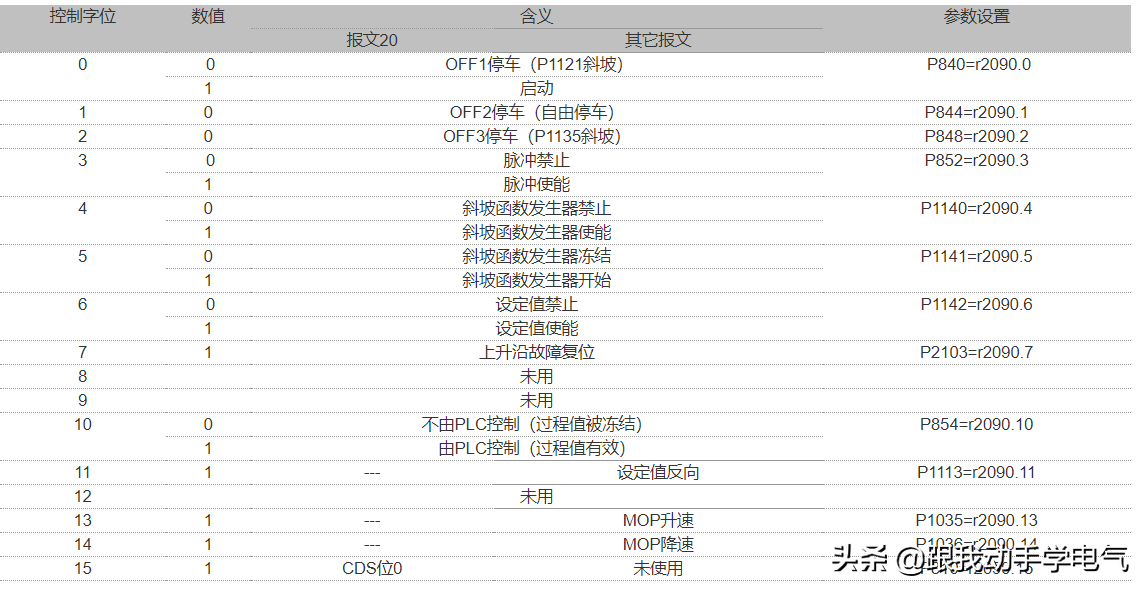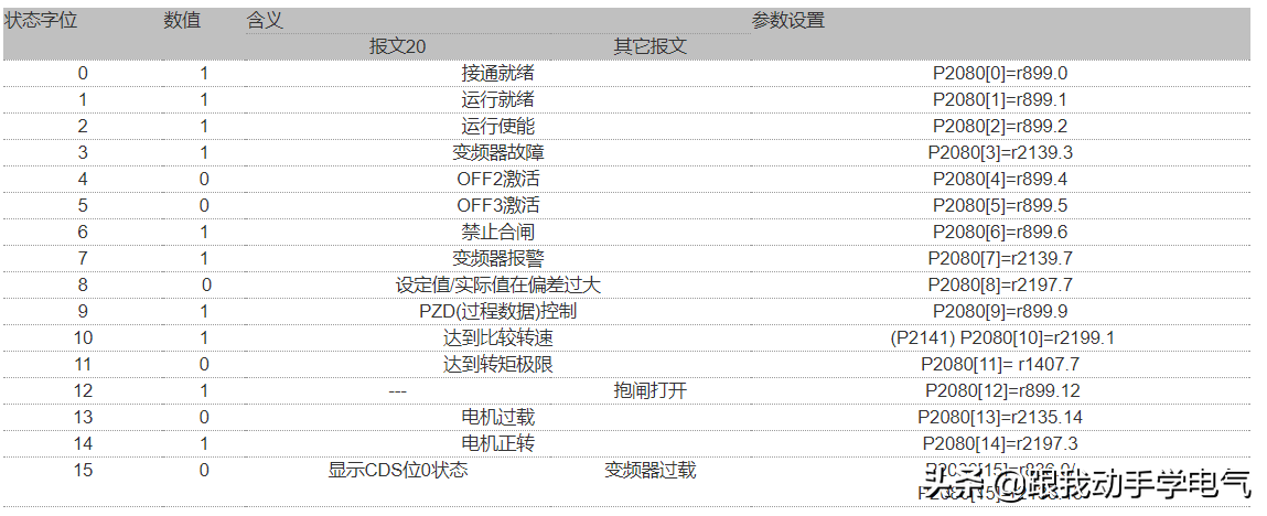 主设定值:速度设定值要经过标准化,变频器接收十进制有符号整数16384(4000H十六进制)对应于100%的速度,接收的最大速度为32767(200%)。参数P2000中设置100%对应的参考转速。
