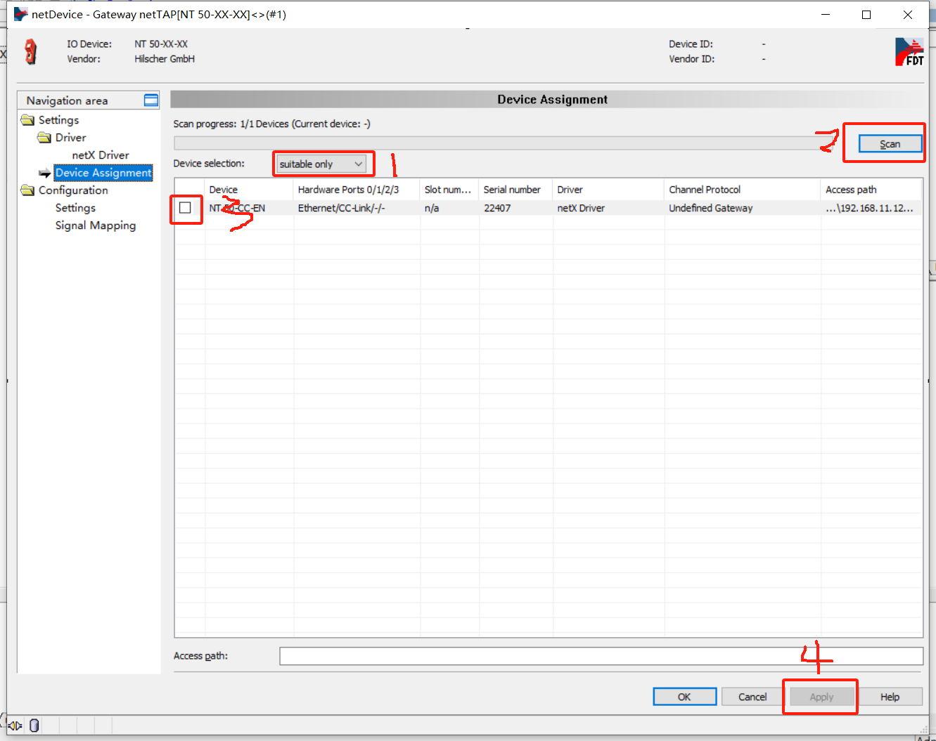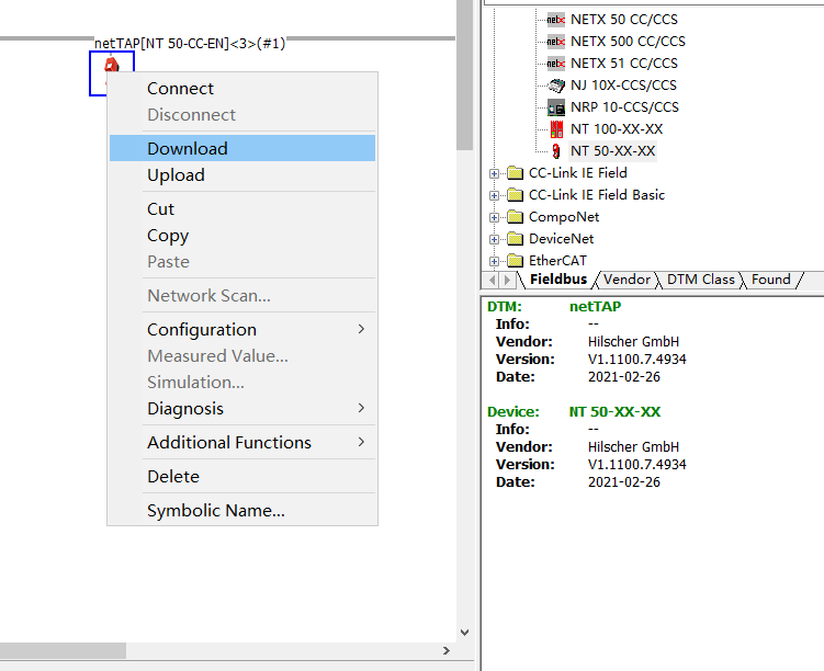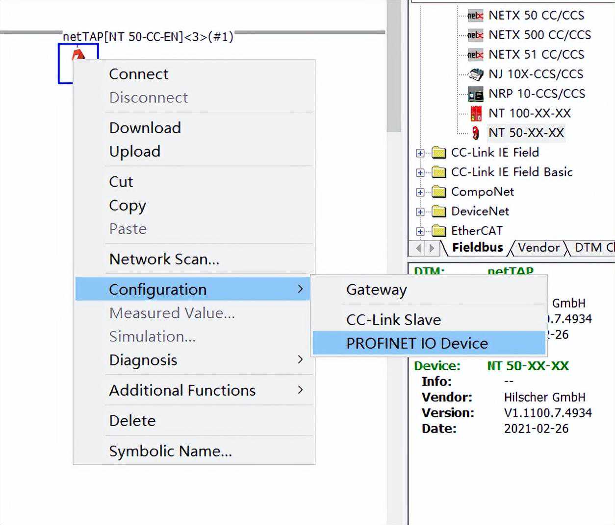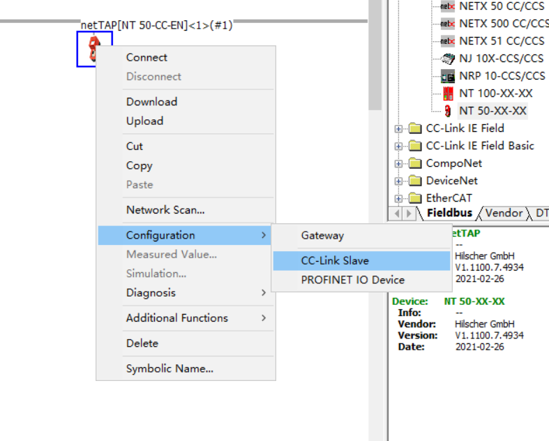 3.打开模块配置软件,添加模块组态,选中模块拖拽到netDevice窗口横线上,右击模块,选择Configuration——Gateway,如下图