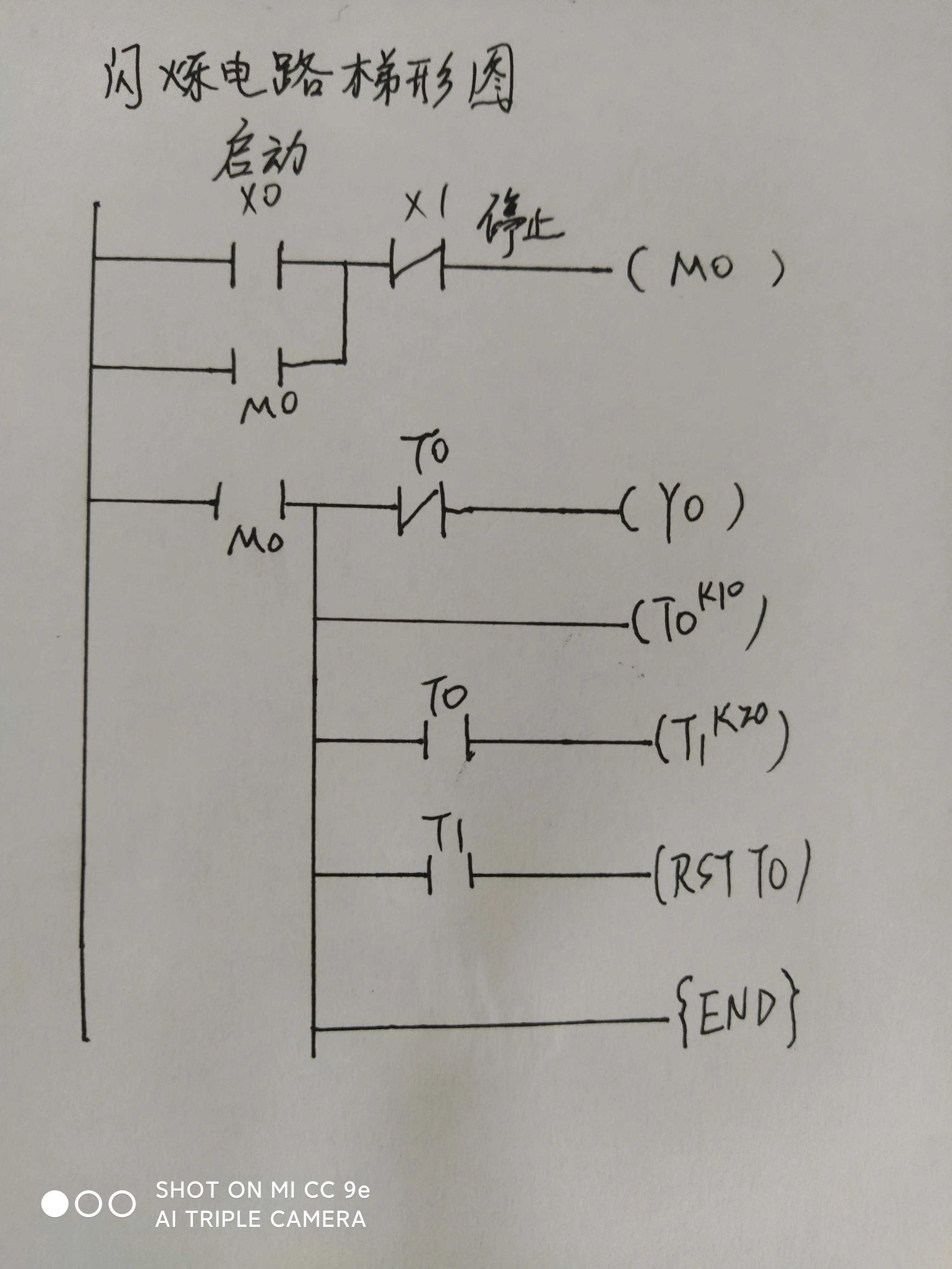 利用三菱PLC做一个闪烁电路,启动按钮按下亮1秒后,灭掉2秒后在再亮1秒,一直循环亮和灭,按停止开关关掉循环。