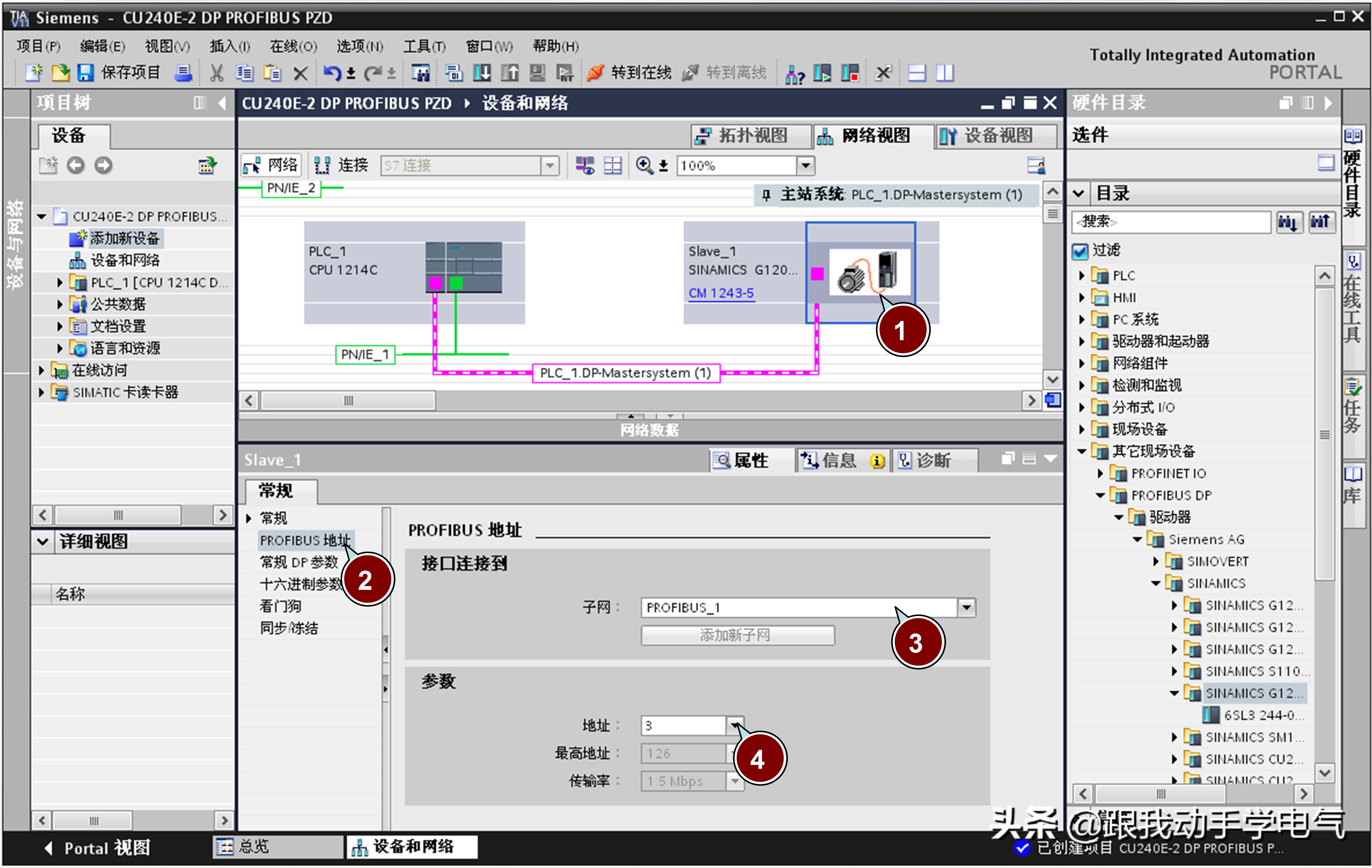 S7-1200硬件组态图1创建S7-1200项目图2添加S7-1200CPU1214C图3添加PROFIBUS主站模块CM1243-5图4添加CU240E-2DPF从站图5分配CU240E-2DPF从......