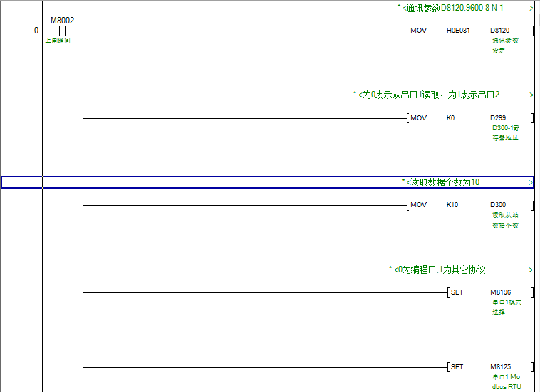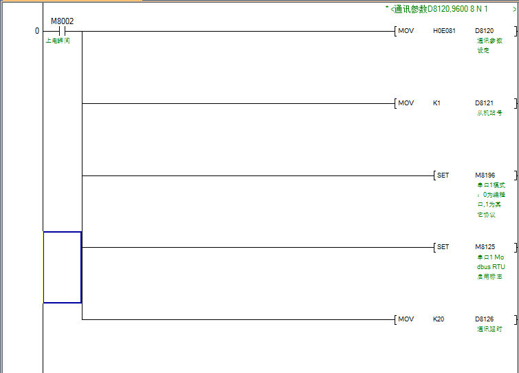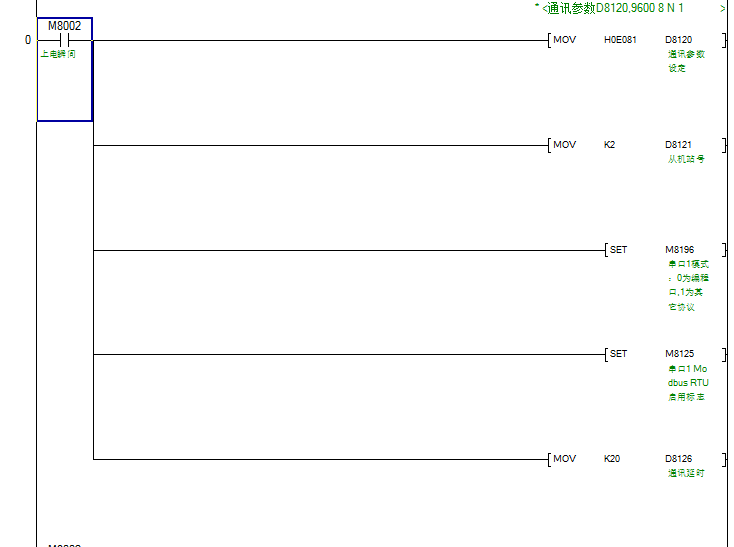 本串口涉及到的特殊继电器有:M8196、M8125、M8122、M8123、M8128、M8029。涉及到的特殊寄存器有:D8120、D8121、D8124、D8125、D8126。