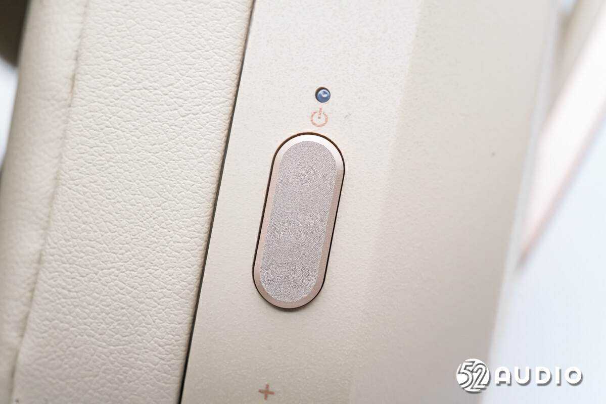 耳壳上的电源开关和指示灯特写,采用了金属材质,边缘打磨亮面倒角,提升产品质感和细节感。