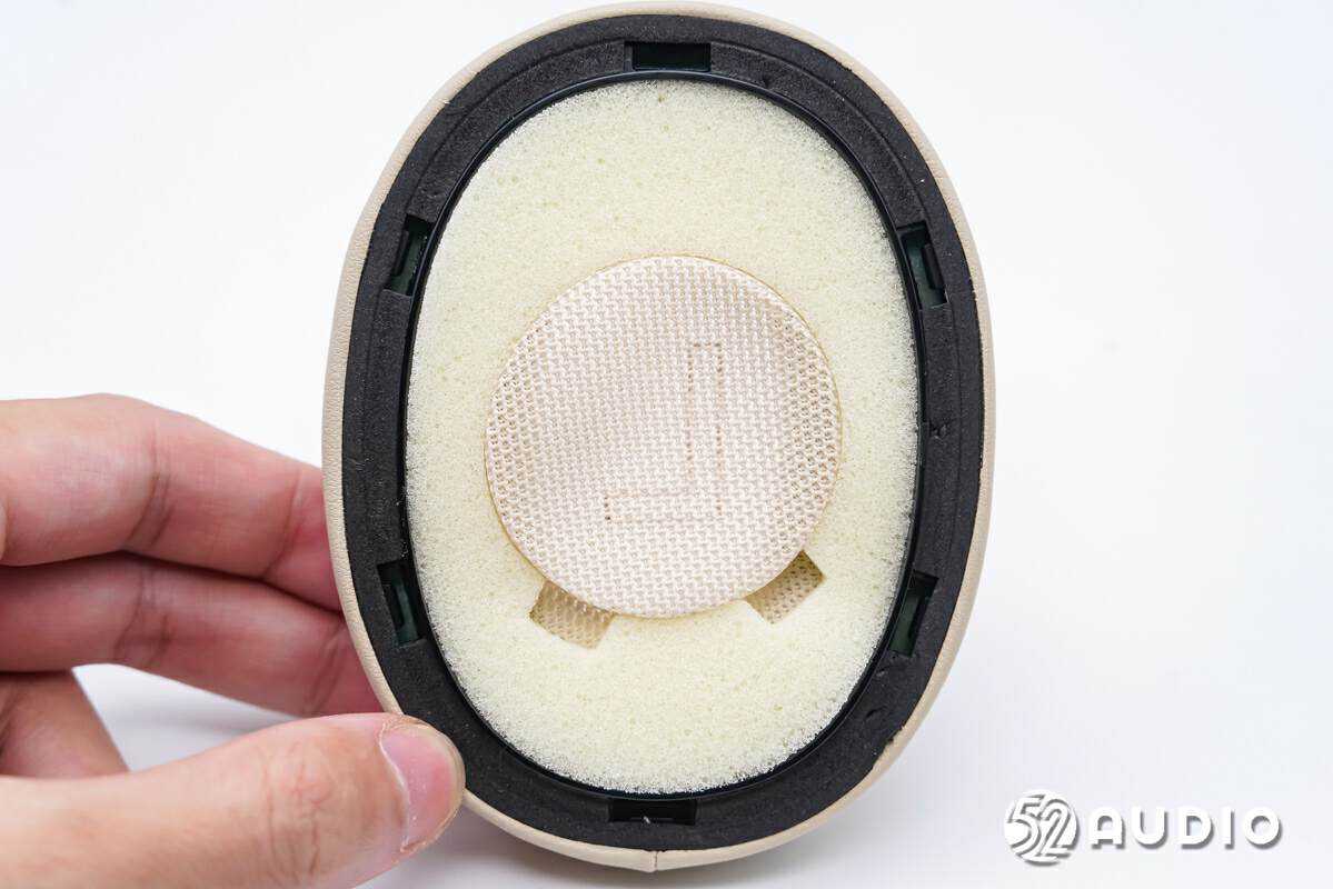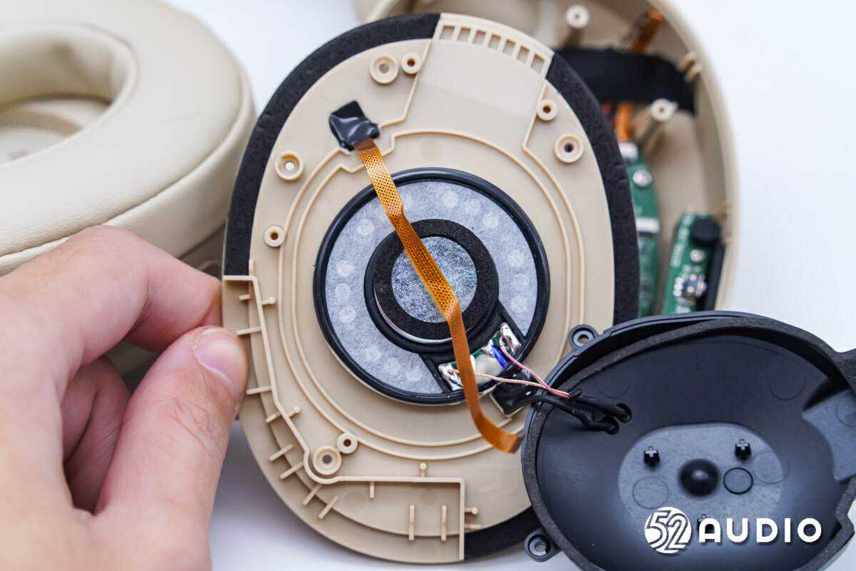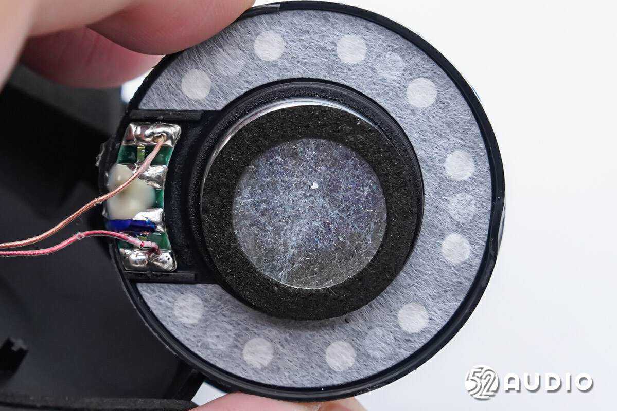 耳机扬声器正面振膜特写,据官方介绍,采用了多种材质制成的双层薄膜,能实现500-10kHz范围内的输出信号失真率(THD)小于1%。
