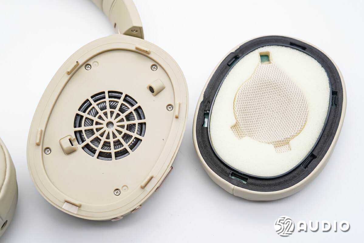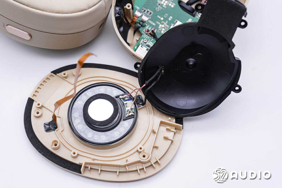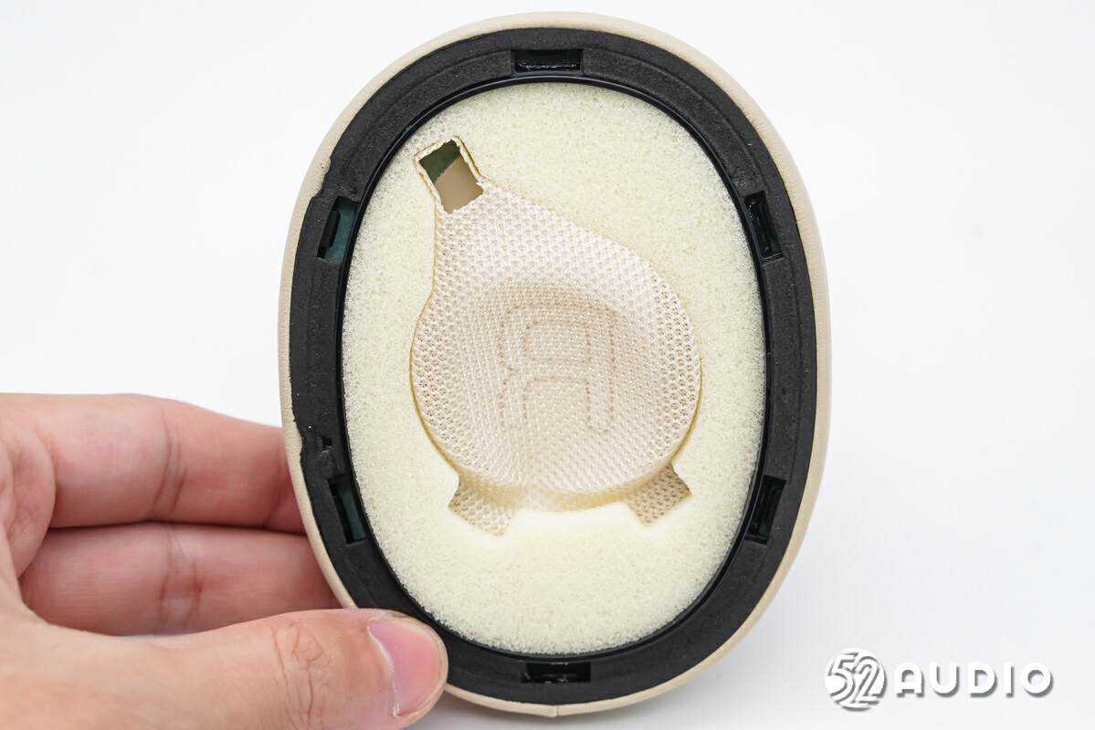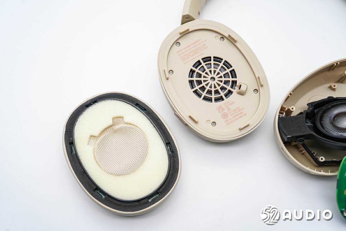 耳机扬声器正面振膜特写,据官方介绍,采用了多种材质制成的双层薄膜,能实现500-10kHz范围内的输出信号失真率(THD)小于1%。