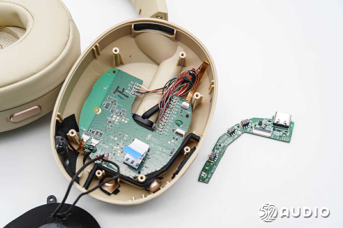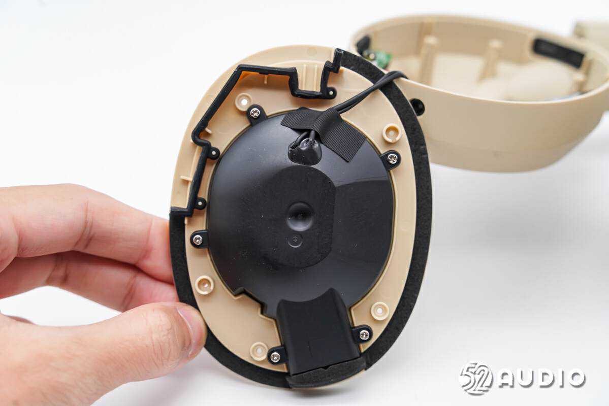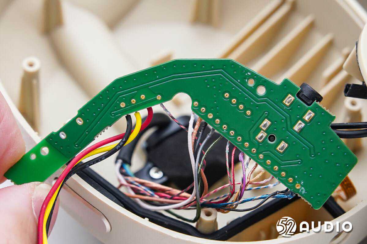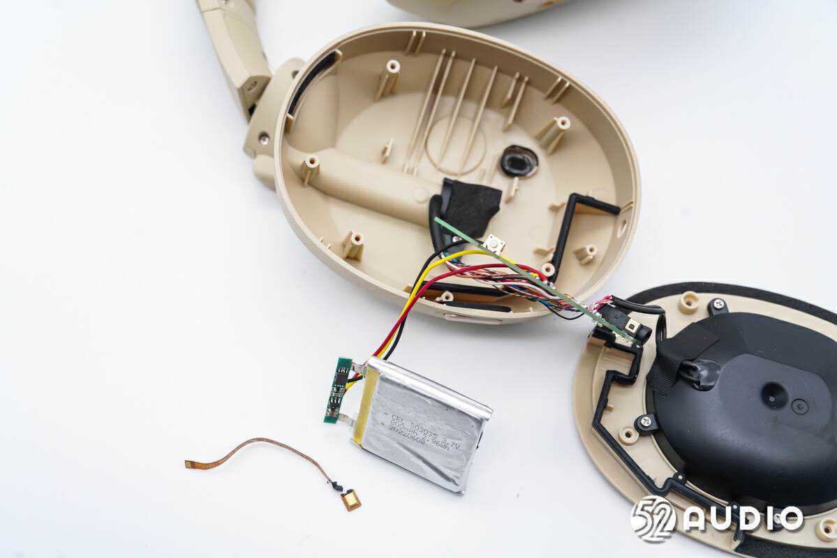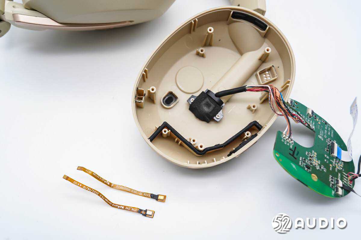 腔体底部结构一览,导线通过悬挂结构连接左耳。腔体壁上固定有两颗降噪麦克风。
