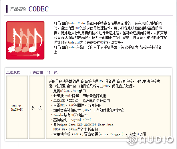 YAMAHA雅马哈YMU831数字降噪IC,内置DSP数字信号处理技术。YMU831适用于移动终端的通话/音乐处理IC,具备通话双麦降噪,耳机主动降噪功能,提升通话体验,独具雅马哈专业DSP,优化音乐处理。
