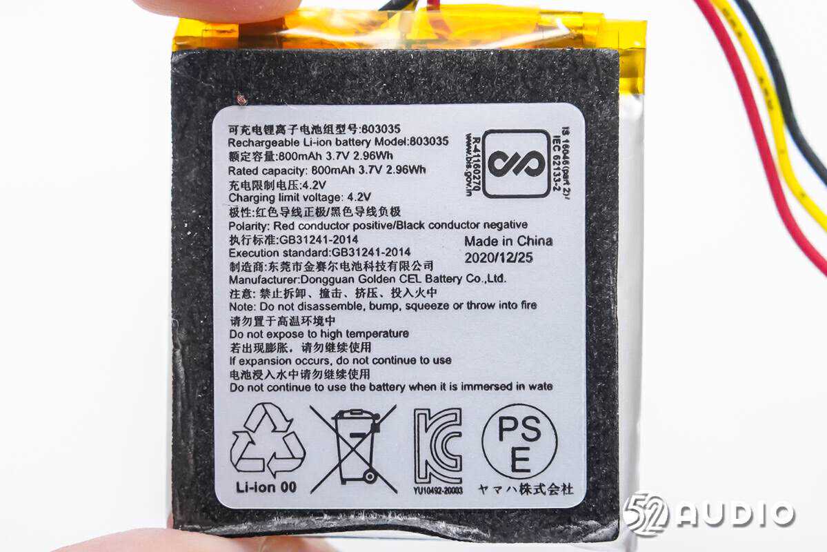 耳机内置锂电池标签上信息,可充电锂离子电池组型号:803035,额定容量:800,充电限制电压:4.2V。