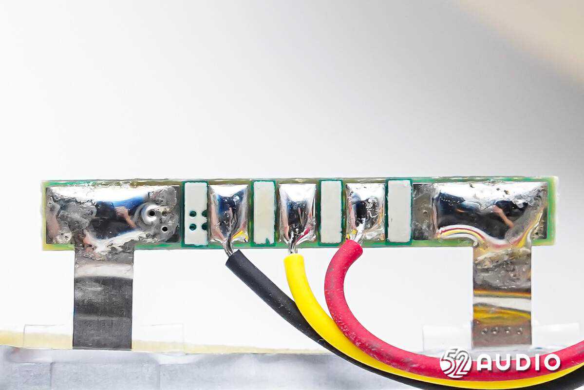PCB小板一侧电路一览,右耳导线与小板焊接连接。