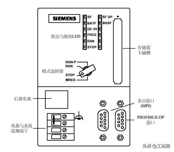 1.电源模块2.后备电池3.24VDC连接器4.模式开关5.状态和故障指示灯6.存储器卡(CPU313以上)7.MPI多点接口8.前连接器9.前盖功能最强的CPU的RAM为512KB,最大8192个存储器位,512个定时器和512个计数器,数字量最大65536I/O点,模拟量通道最大为4096。有350多条指令。一个数字量为1点,一个模拟量为16点。计数器的计数范围为1~999,定时器的定时范围为10ms~9990s。