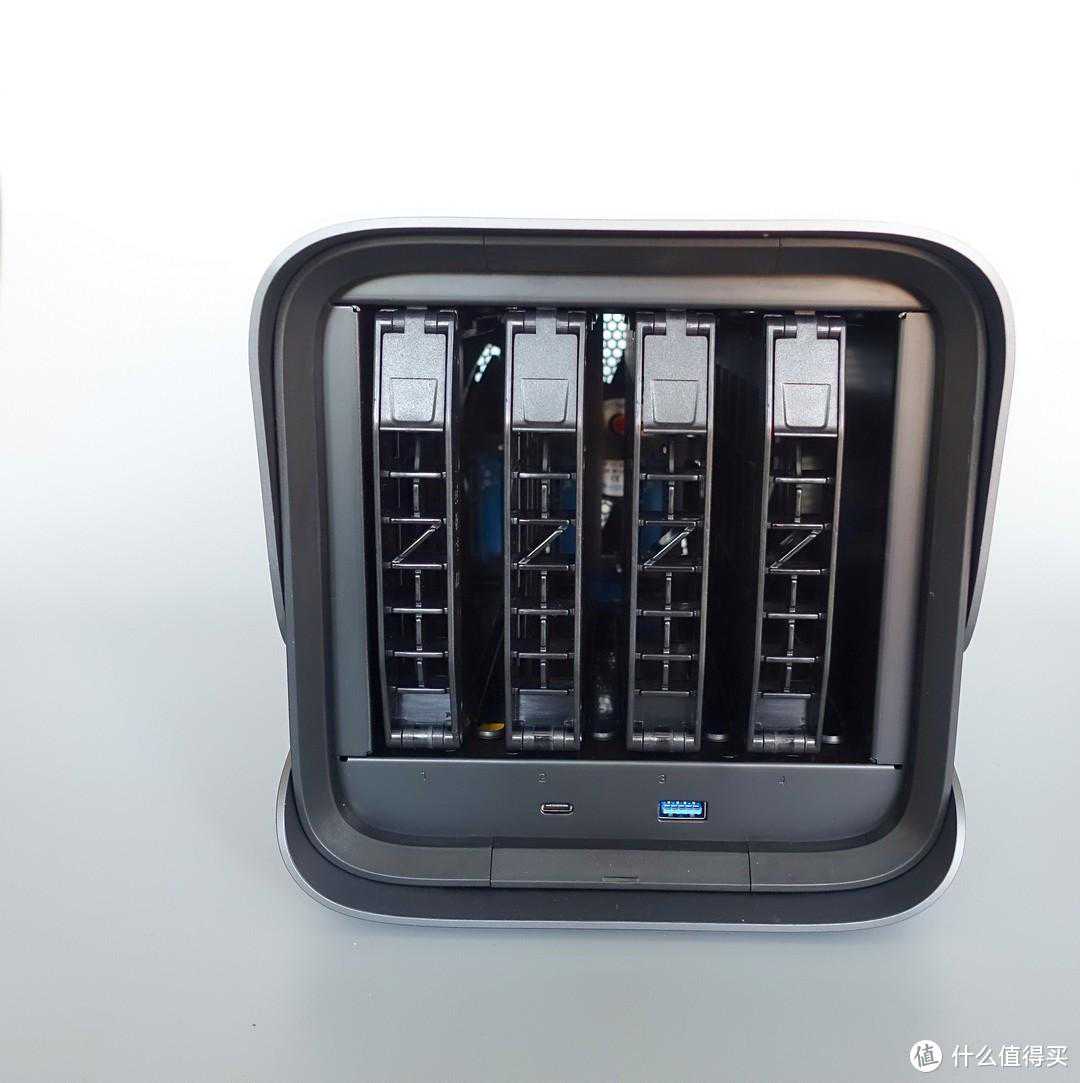 前面板的底部,有一个接口和一个5G速度的Type-C接口。可以明显看到的是,硬盘支架之间的空隙预留的非常充足,基本是我见过成品NAS里最大的了,这样可以促进硬盘之间的空气流动,加强对硬盘的散热效果。