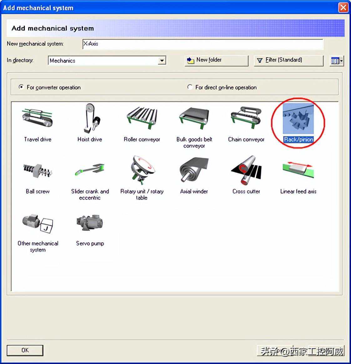 Step1:客户要求中已说明X轴是齿轮齿条传动,在“机械系统”中创建一个新的机械系统,名叫“X-Axis”: