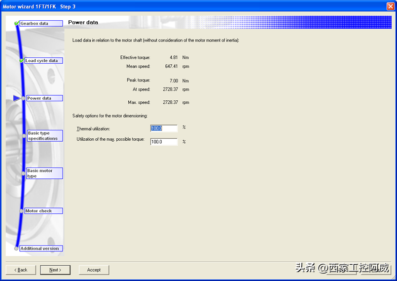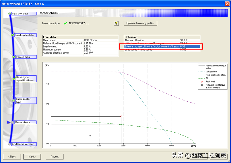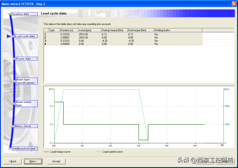 进入后可见,系统已自动计算出了此工况下(无减速机),电机的转速363.78rpm,电机的转矩45.11Nm,折算到电机轴的负载侧转动惯量0.35525kgm^2:
