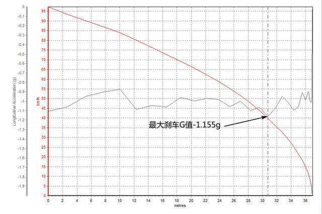 奔驰C2004MATIC运动版100-0km/h的刹车距离为:38.95m,最大刹车G值为:-1.155G。