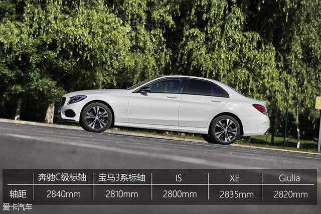上图表格列举了国内能够买到的国外品牌C级标轴轿车的轴距数据,虽然它的轴距与长轴版奔驰C级相差悬殊,但如果把它放在同样都未加长轴距的对手面前,它的轴距其实是最长的。