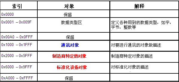 例如在CiA301标准中,设备通讯的参数放在索引范围0x1000-0x1FFF(通讯行规区)。此区域的前几项如下表: