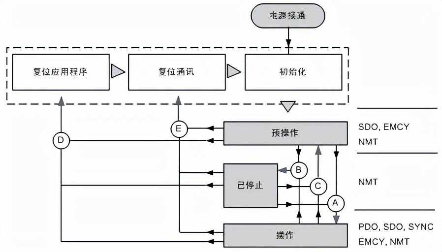 下图显示的是NMT状态、关联的可用通讯对象(PDO、SDO、SYNC、EMCY和NMT)和5种状态转换(A到E)。