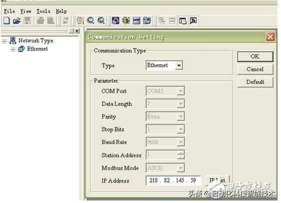 (1)在PC2上打开WPL软件,在通讯设置中,选择“Ethernet”,选择指定IP为ADSL的IP地址:218.82.145.059。如果该IP地址下连接了多台设备(RS485),则可通过图8中的通讯站号来区分。可实现分别对各台设备进行监控操作。