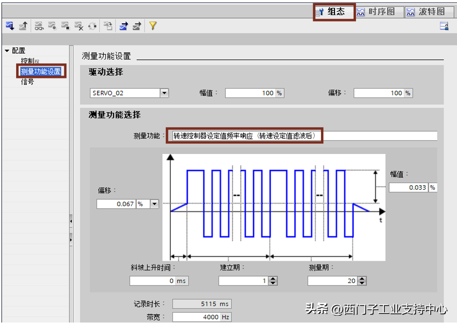双击添加的Measuringfunction,在“测量功能设置”中,选择测量的类型,例如:转速控制器设定值频率响应(转速设定值滤波后),设置信号的偏移、幅值等相关信息。