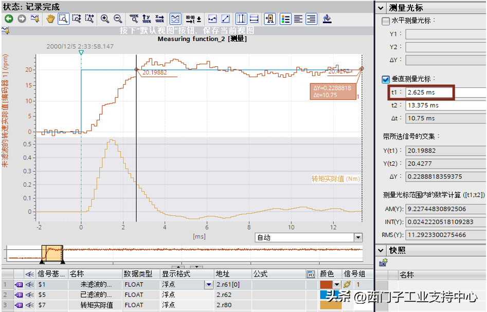 打开“时序图”选项卡,查看测量结果,实际速度r61第一次达到设定速度r62的时间是2.625ms。