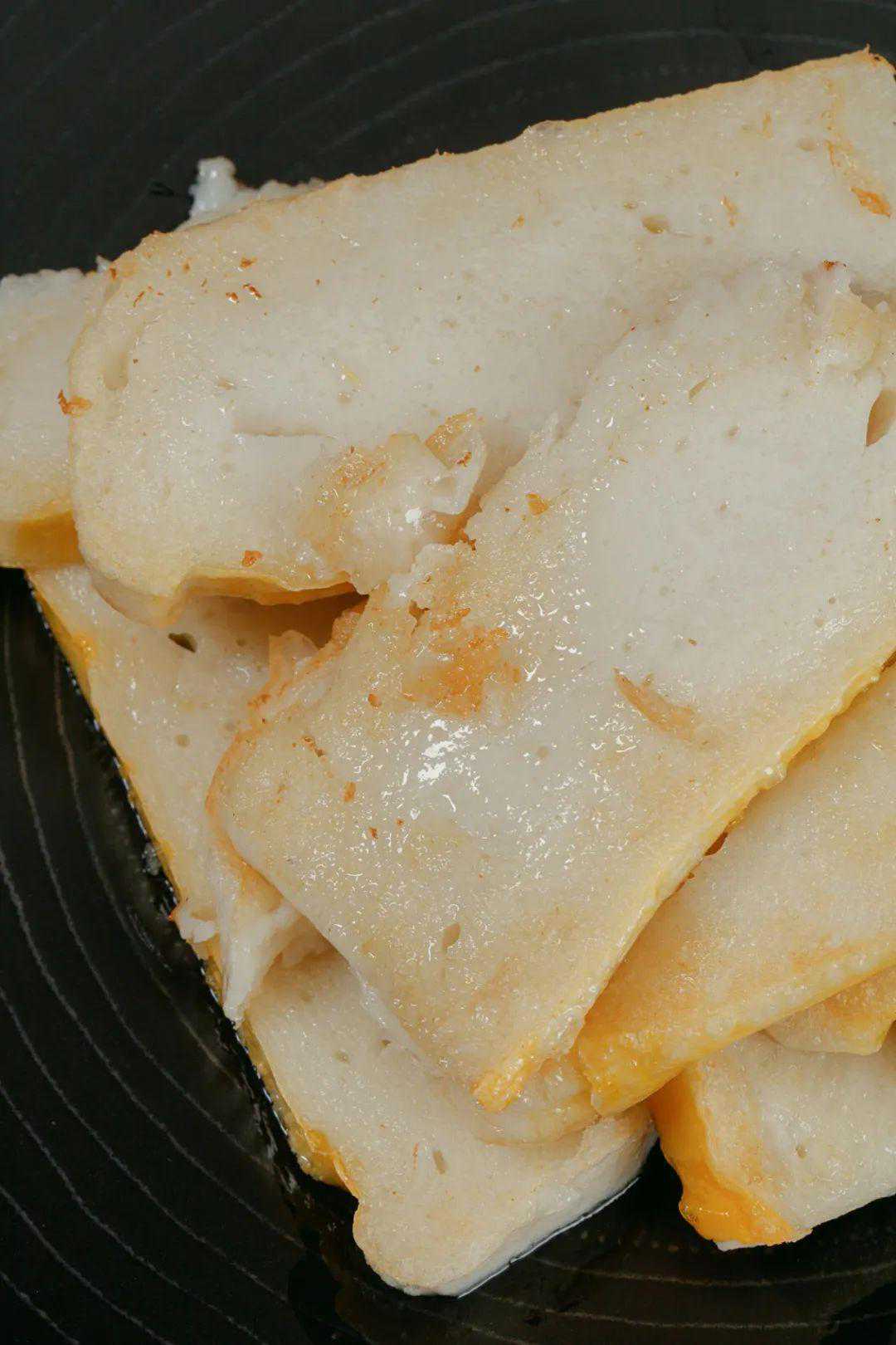 鱼糕的吃法很多,蒸煮烹炸样样都行,我们为了省事,选择了两种快速吃法。一是煎,切成厚实的片状,锅内放油,煎个几分钟。煎制后的鱼糕,入嘴后是细腻软嫩,跟豆腐有的一拼,还能吃出鱼肉和猪肉混合后的鲜美。
