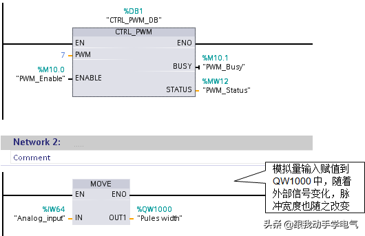 在定义完变量后,打开OB1,从指令列表中将CTRL_PWM指令块拖入编辑器中,并定义背景数据块,最后添加模拟量赋值程序。如图11